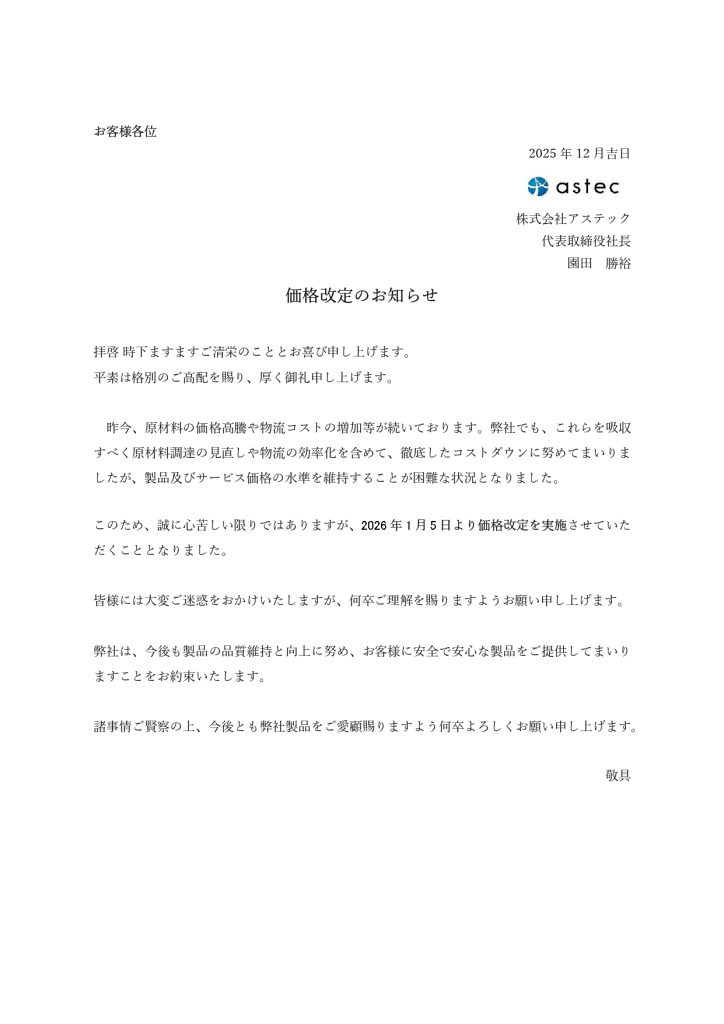 2026年1月からの製品価格改定についてご報告させていただきます。