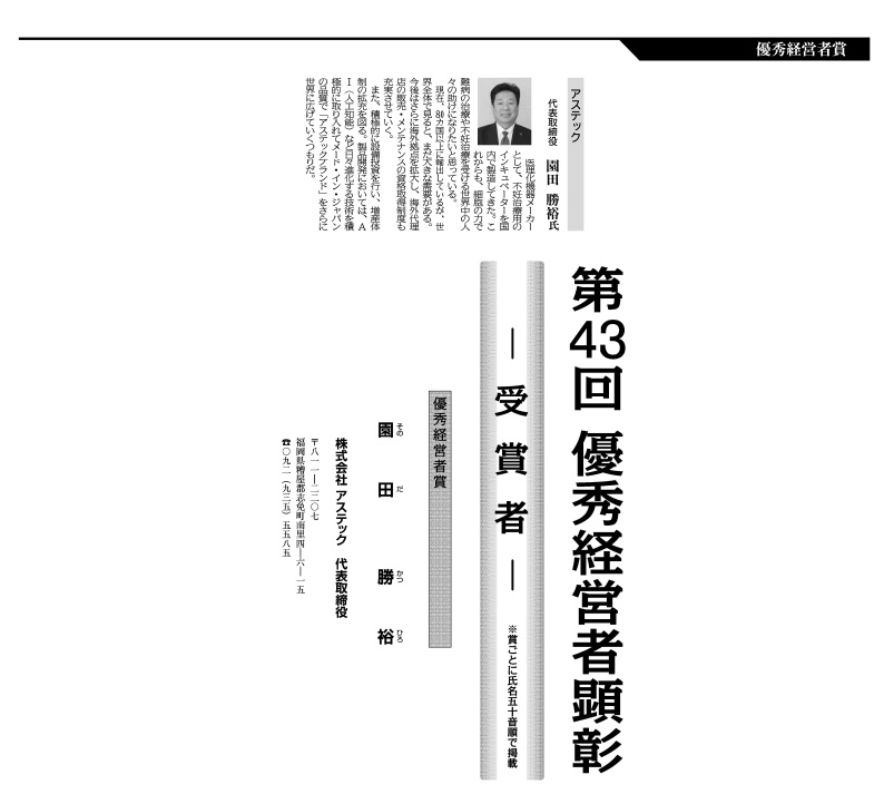 先日、弊社代表園田 勝裕が日刊工業新聞社主催「第43回優秀経営者顕彰(2025年12月26日付掲載)」において優秀経営者賞を受賞いたしました。